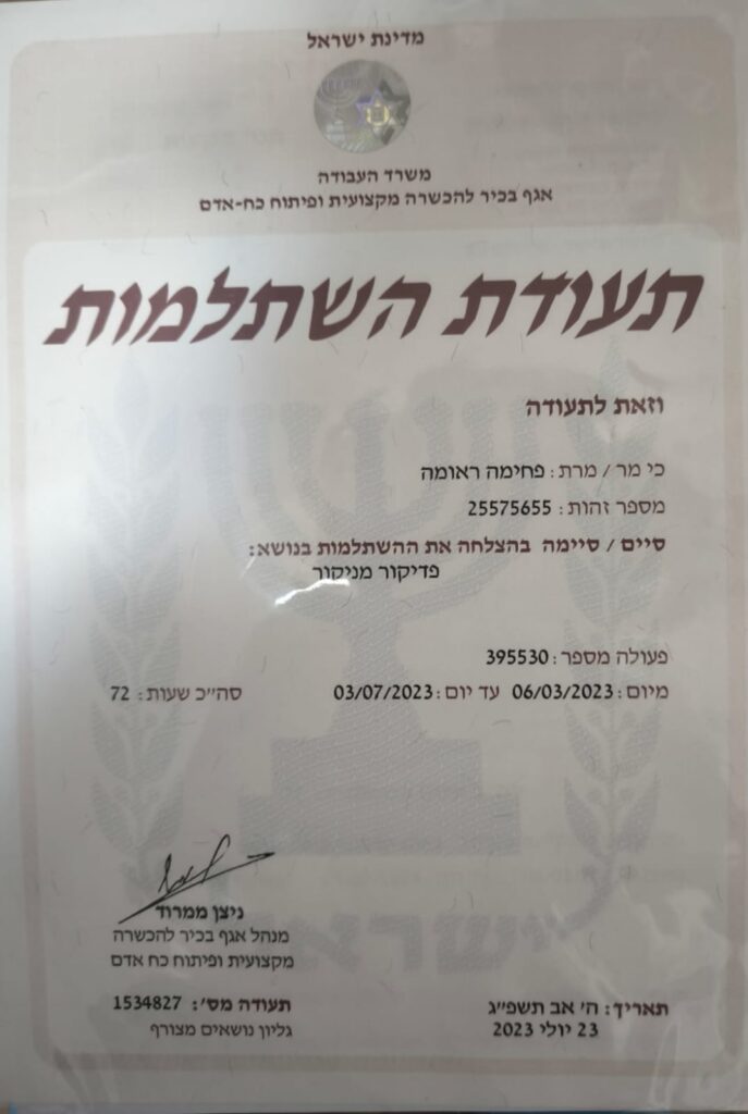 "ראומה פשוט מושלמת! אחרי מניקור רפואי הידיים שלי חזקות, מבריקות ונראות מדהים."